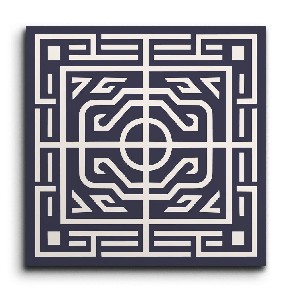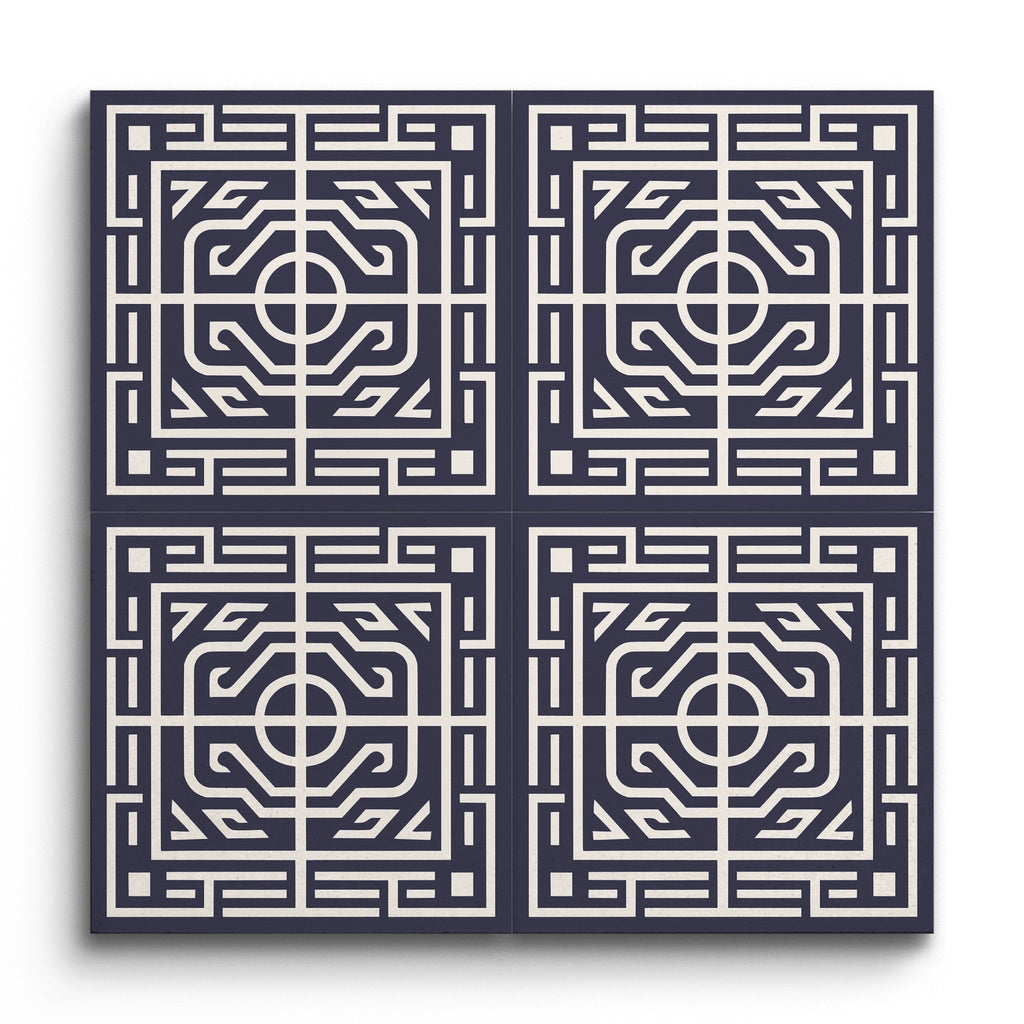 This decor tile showcases a captivating geometric design, where interconnected lines and shapes form an intricate maze-like structure. Set against a dark navy blue background, the contrasting white lines create a bold visual impact. The clean and precise pattern highlights symmetry and balance, offering a striking centerpiece for any room.