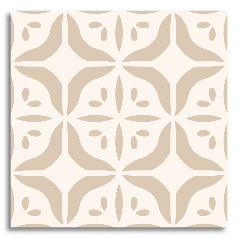 This decor tile showcases an encaustic-inspired pattern with a symmetrical design, featuring floral or leaf-like motifs. The soft green hues are beautifully contrasted against a creamy white background, offering a classic and harmonious aesthetic. Its intricate style brings an elegant and timeless charm to any setting.