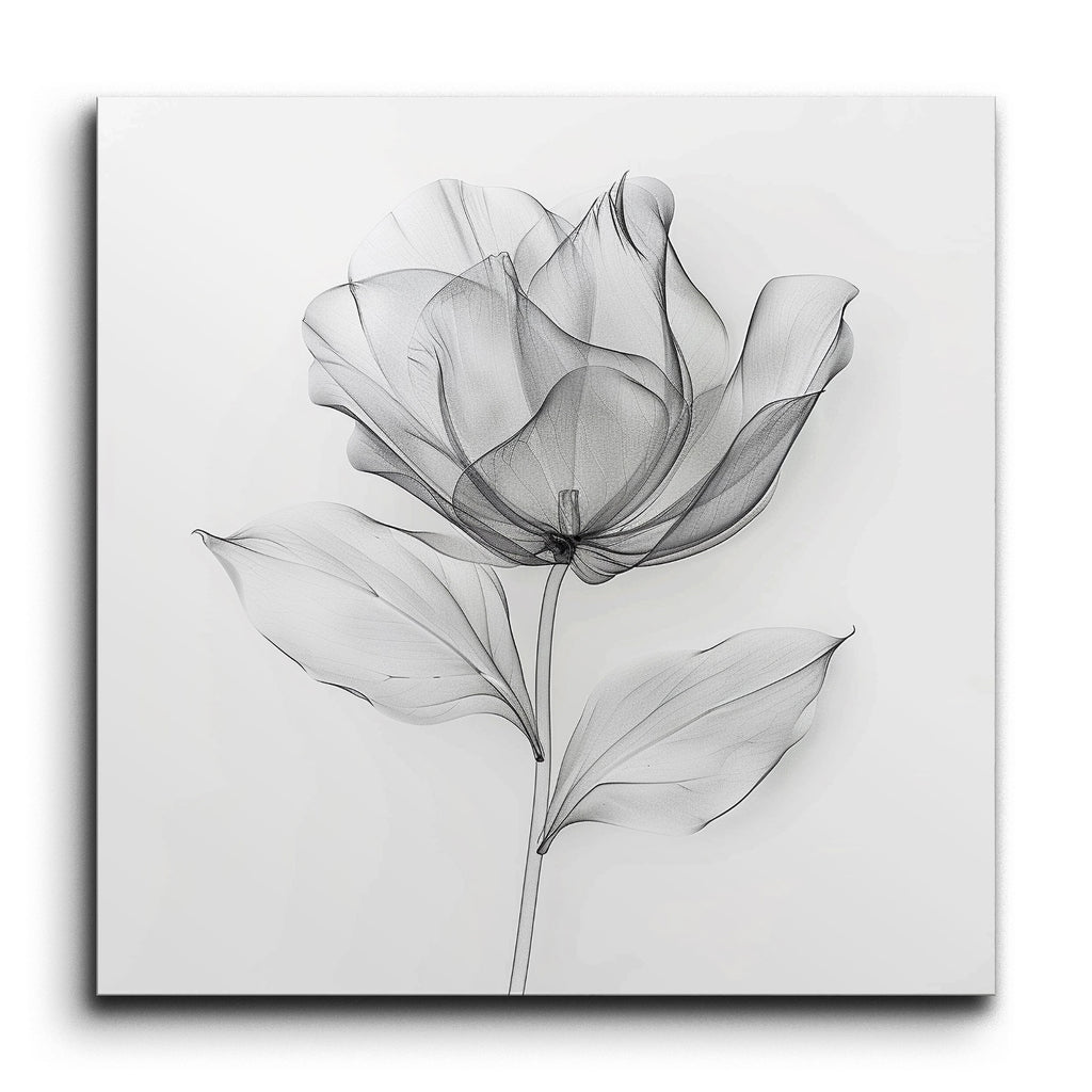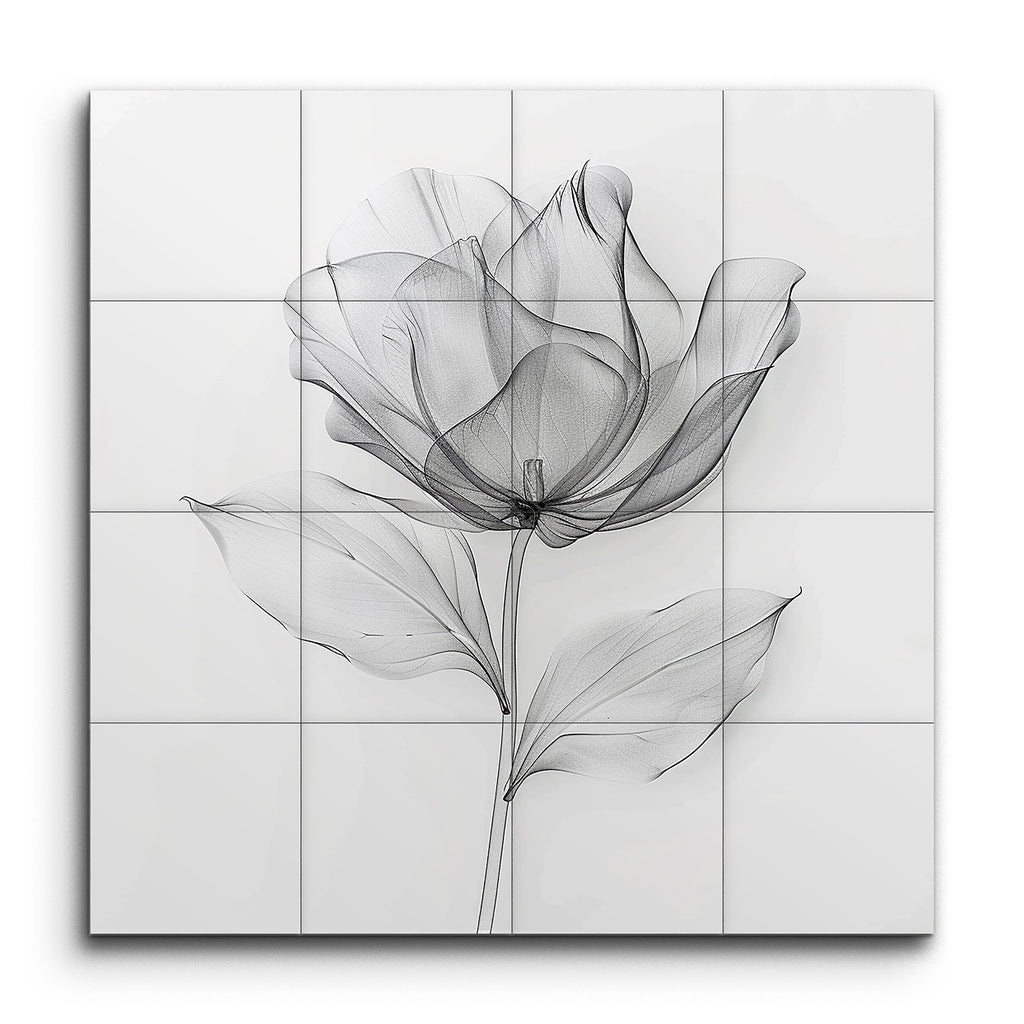 Immerse yourself in the delicate elegance of our tile mural, featuring an ethereal flower rendered in a minimalist, modern style. Fine, wispy lines create a translucent, almost ghostly bloom, with intricately detailed petals that suggest depth and texture. The soft, flowing lines of the stem and leaves enhance the sense of movement and grace. Balanced and harmonious, the monochromatic shades of gray and black add simplicity and sophistication, blending botanical illustration with abstract art for a weightless, airy aesthetic.