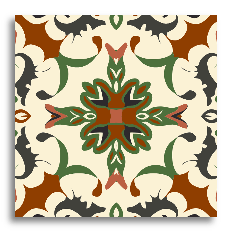 This decor tile showcases an intricate, symmetrical pattern with a central floral motif surrounded by radiating elements. The design elegantly blends curved and pointed shapes, achieving a harmonious balance. The color palette features shades of black, grey, and beige, with subtle hints of terracotta, offering a timeless appeal with a modern twist. Its style draws inspiration from traditional encaustic tiles, celebrated for their elaborate and decorative patterns.