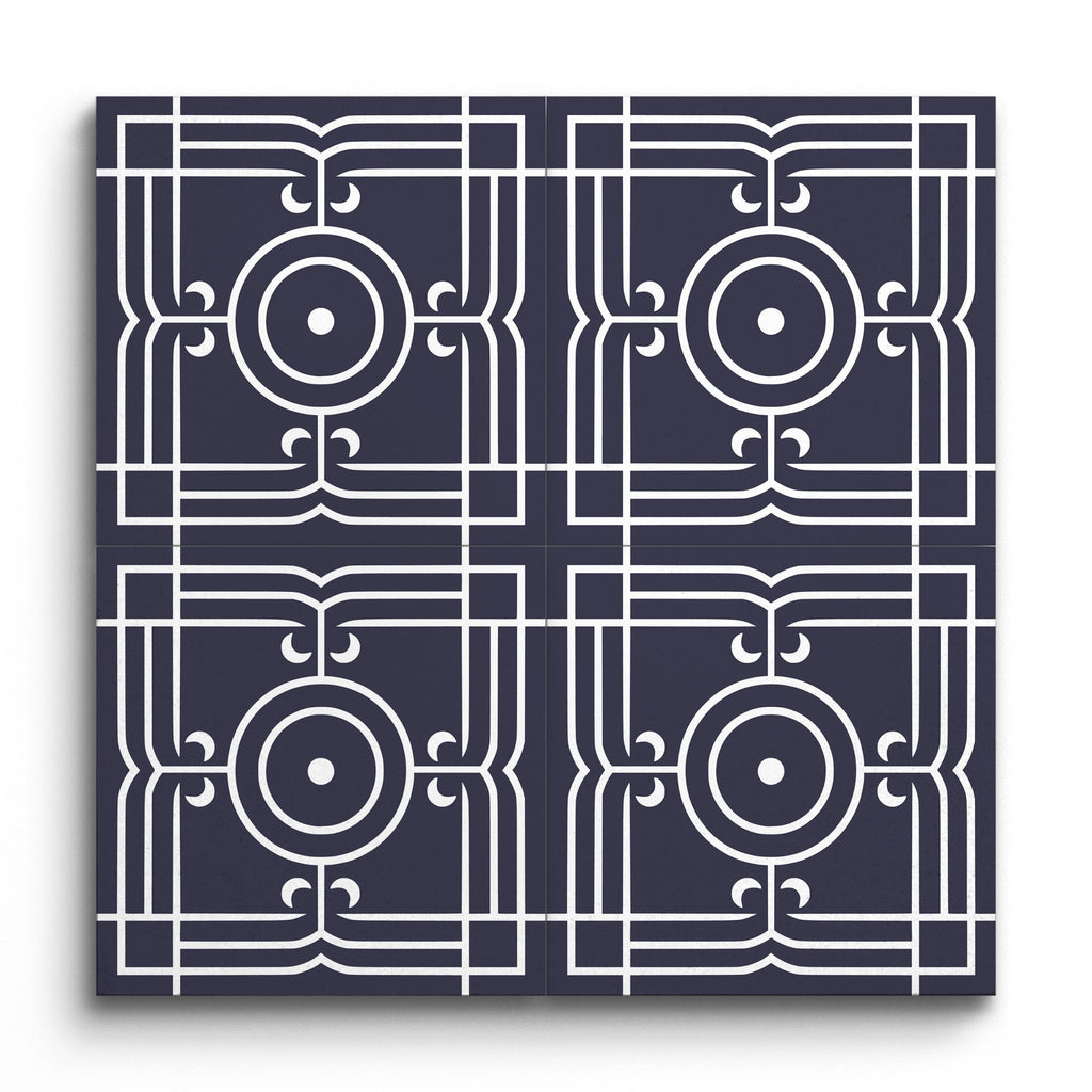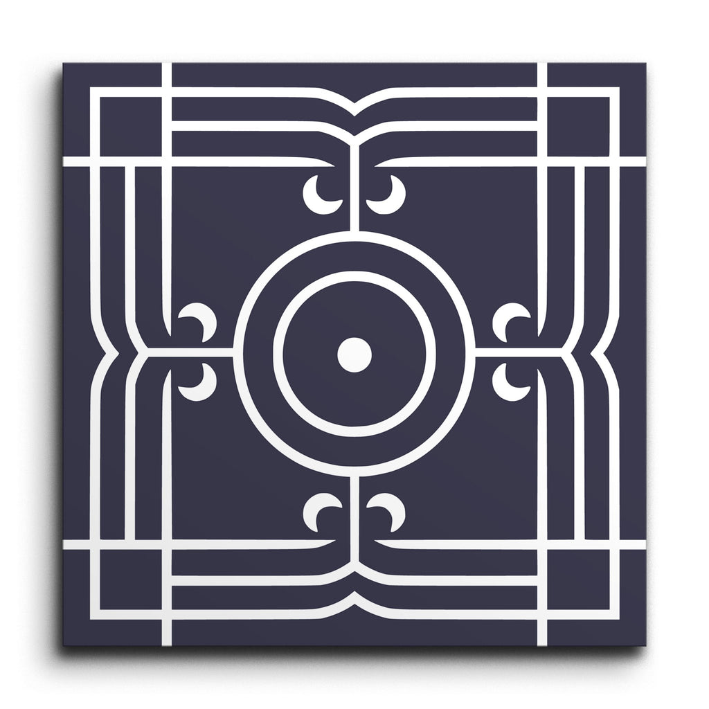 This decor tile showcases a captivating geometric pattern, highlighted by a central circle that anchors the design. Symmetrical lines and shapes radiate outward, capturing a sense of balance and harmony. The crisp white lines set against a rich navy background create a striking contrast, drawing attention to the clean, precise geometry. The design embodies a modern, minimalist aesthetic, emphasizing simplicity and structure that complements contemporary spaces.
