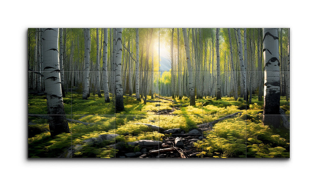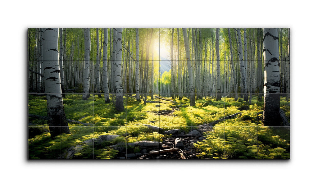 The artwork captures a tranquil forest scene, showcasing tall birch trees with distinctive white bark and black markings amidst vibrant green leaves. Sunlight filters through the canopy, creating a dappled pattern of light and shadow on the mossy forest floor, which is scattered with stones and fallen branches. The light source, likely a sunrise or sunset, casts a warm, golden glow, imparting a serene and ethereal quality to the scene. The detailed, realistic style emphasizes the natural beauty and peacefulness of the forest.