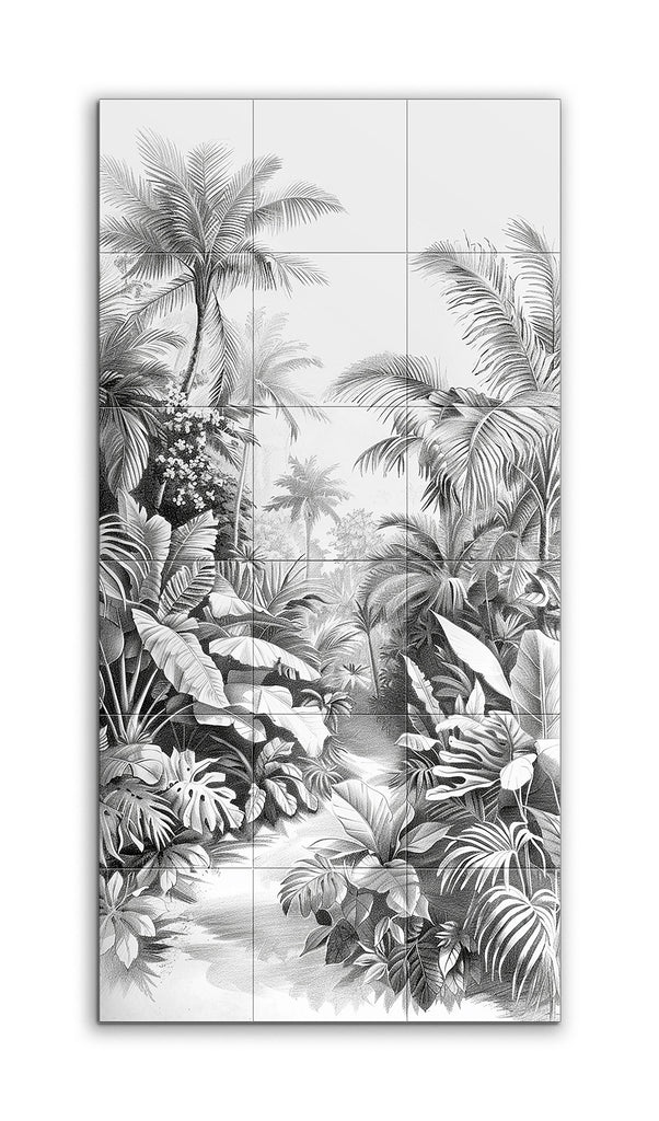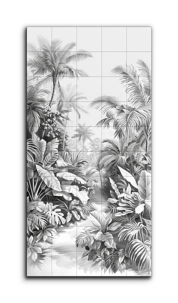 This tile mural showcases a lush, tropical jungle scene in a monochromatic palette. Detailed foliage includes tall palm trees with broad fronds, dense undergrowth of banana leaves, and philodendrons. A winding path or stream adds depth, guiding the viewer deeper into the jungle. The realistic style captures intricate textures and forms, while shading and gradients enhance depth. The monochromatic scheme lends a timeless, classic feel, evoking the serene beauty of a tropical jungle.