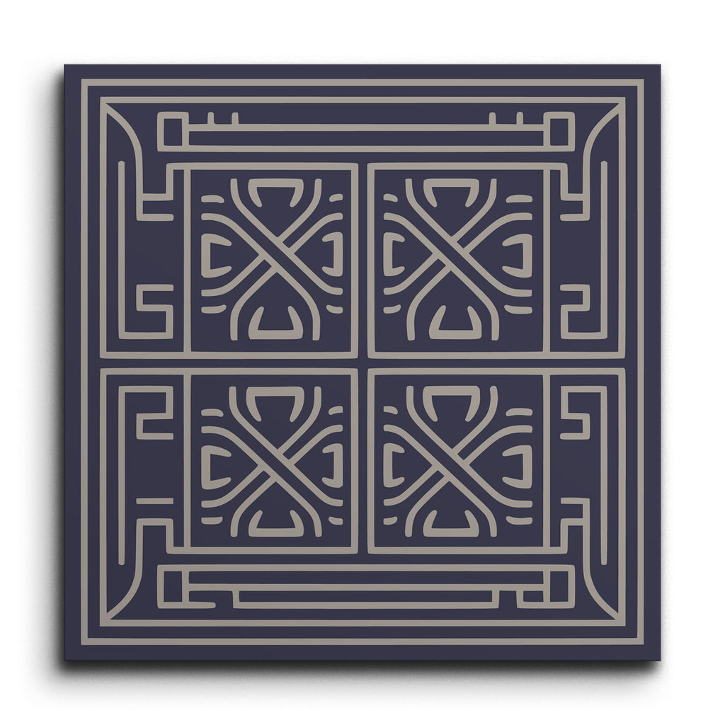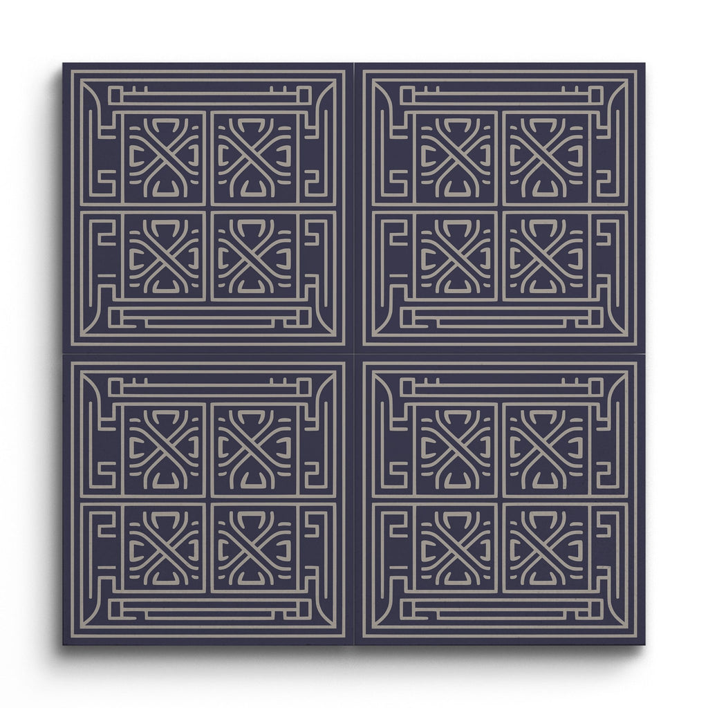 This decor tile showcases a captivating geometric pattern, where intricate and symmetrical shapes come together to form a harmonious motif. The design features intersecting lines and curves, creating a sense of rhythm and precision. A dark navy background provides a striking contrast to the lighter gray lines, enhancing the tile's depth and visual appeal. Its modern and sleek style, highlighted by clean lines and a structured aesthetic, makes it a sophisticated addition to any space.