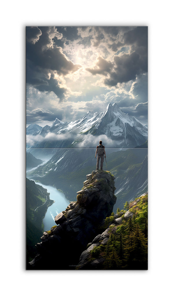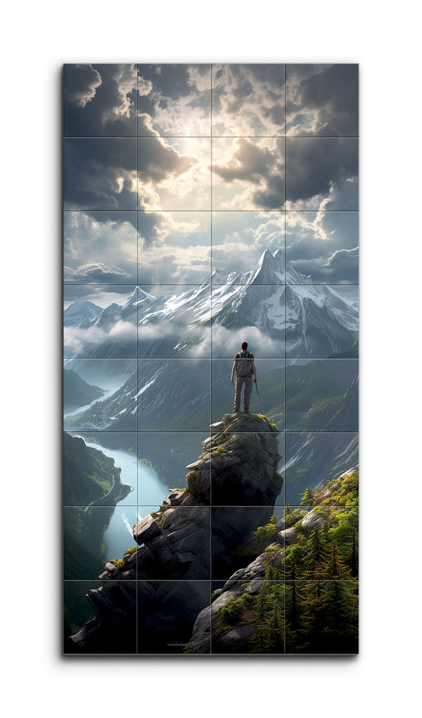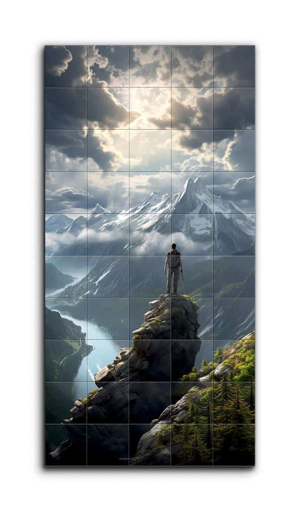 This tile mural captures a breathtaking mountainous landscape where a lone figure stands on a rocky outcrop, gazing at a majestic snow-capped peak. The dramatic sky above is filled with dynamic clouds and rays of sunlight that cast a heavenly glow over the mountains. Below, the figure overlooks a lush, green valley with a winding river that reflects the sky. Dense forests cover the surrounding mountains, enhancing the untouched natural beauty. The realistic style and meticulous detail create a lifelike, awe-inspiring scene.