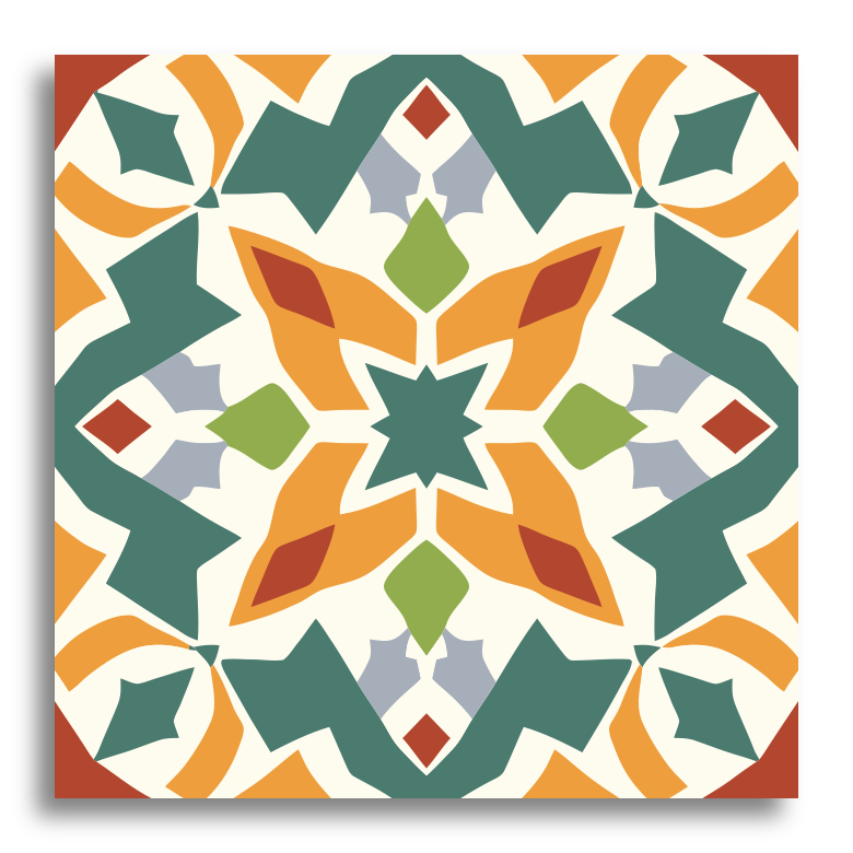 This decor tile captures the essence of traditional encaustic artistry with its intricate geometric shapes and symmetrical designs. At its heart lies a striking star-like motif in rich dark blue, encircled by a harmonious blend of curved and angular forms in lively shades of orange, gray, and brown. The detailed pattern boasts a captivating mix of warm and cool tones, resulting in a visually stunning and balanced composition. Its vibrant and dynamic appearance ensures that this tile will be a standout piece, adding a touch of timeless elegance and charm to any setting.