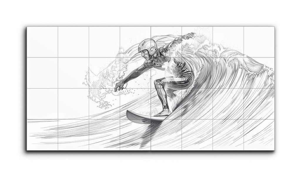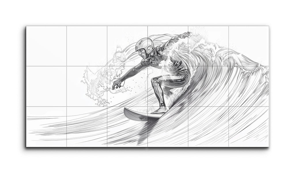 This tile mural features a dynamic scene of a surfer riding a large wave, positioned centrally, crouched low on the surfboard with one arm extended forward. The detailed figure showcases the wetsuit and helmet, adding realism. Intricate line work captures the fluid motion of the wave, with thin, curved lines emphasizing movement. The frothy crest is illustrated with chaotic lines, creating a sense of turbulence. The monochromatic line art, devoid of shading, focuses on depth and texture, making the action and skill of the surfer palpable.