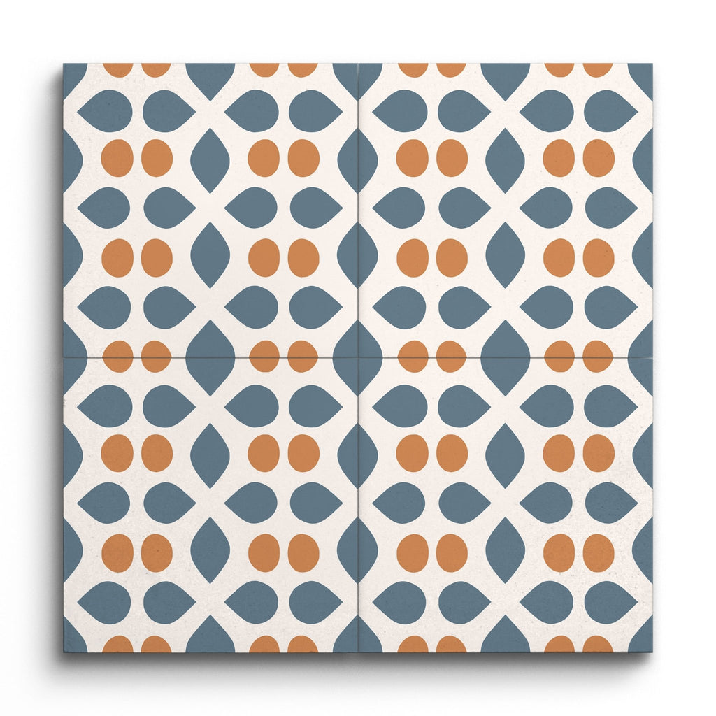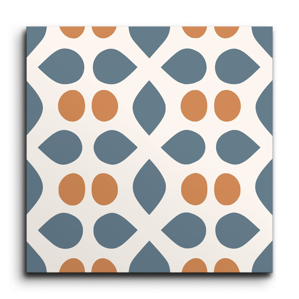 This decor tile showcases a geometric design with a harmonious blend of leaf-like shapes and circles. The muted blue and warm terracotta tones against a cream background create a balanced and inviting palette. Its symmetrical and straightforward pattern adds a touch of modern elegance, perfect for those who appreciate clean and contemporary aesthetics.